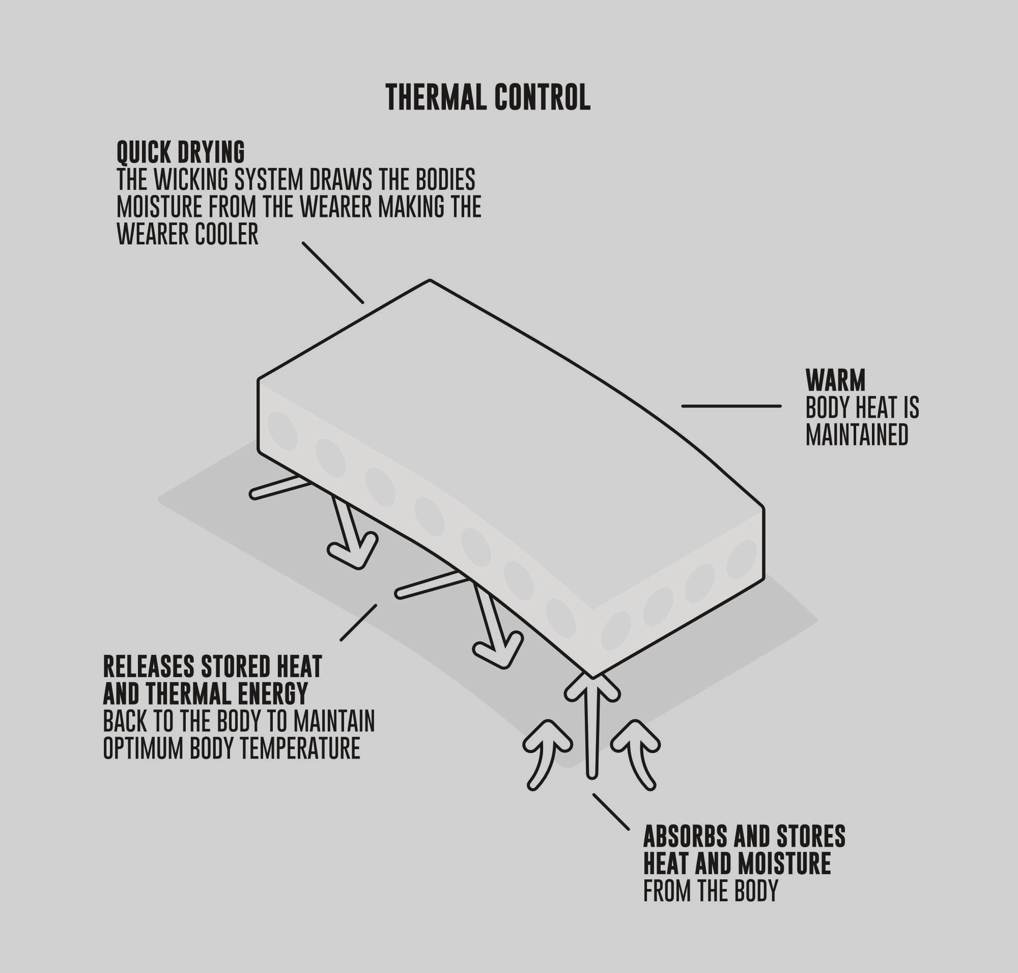 Temperature-balancing tech that absorbs your body's heat and moisture, and then redistributes it to eliminate cold and hot spots. Stay in total control in all conditions.