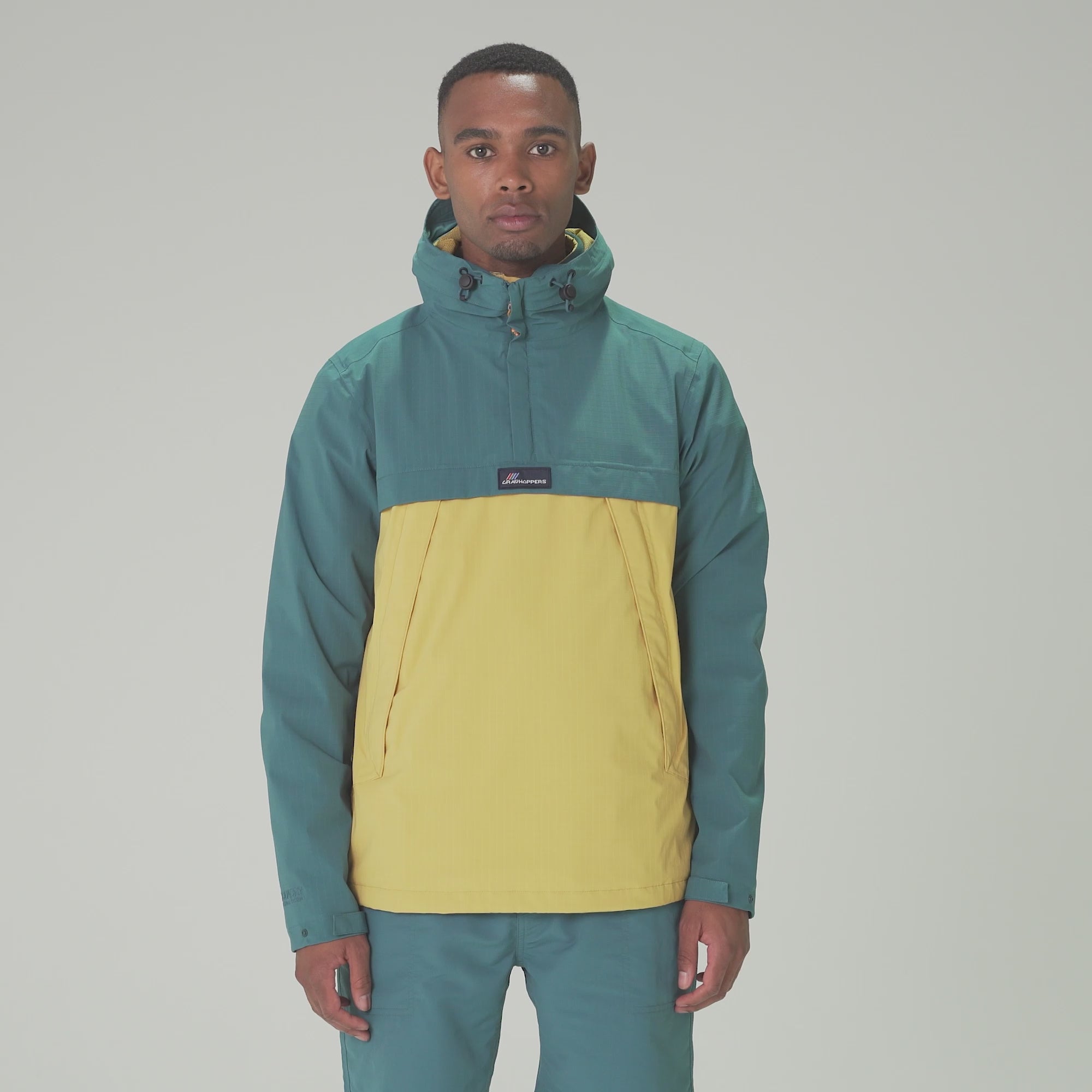Sacramento Green/Sunrise YellowHandy overhead waterproof jacket from Craghoppers. ‘Anderson’s’ AquaDry Membrane stretch construction with EcoShield DWR is designed to lock wet weather out, with the agility to respond to active outdoor adventures. On-trend styling with concealed hood, zipped pockets and half-zip cagoule fastening with triple stormflap.