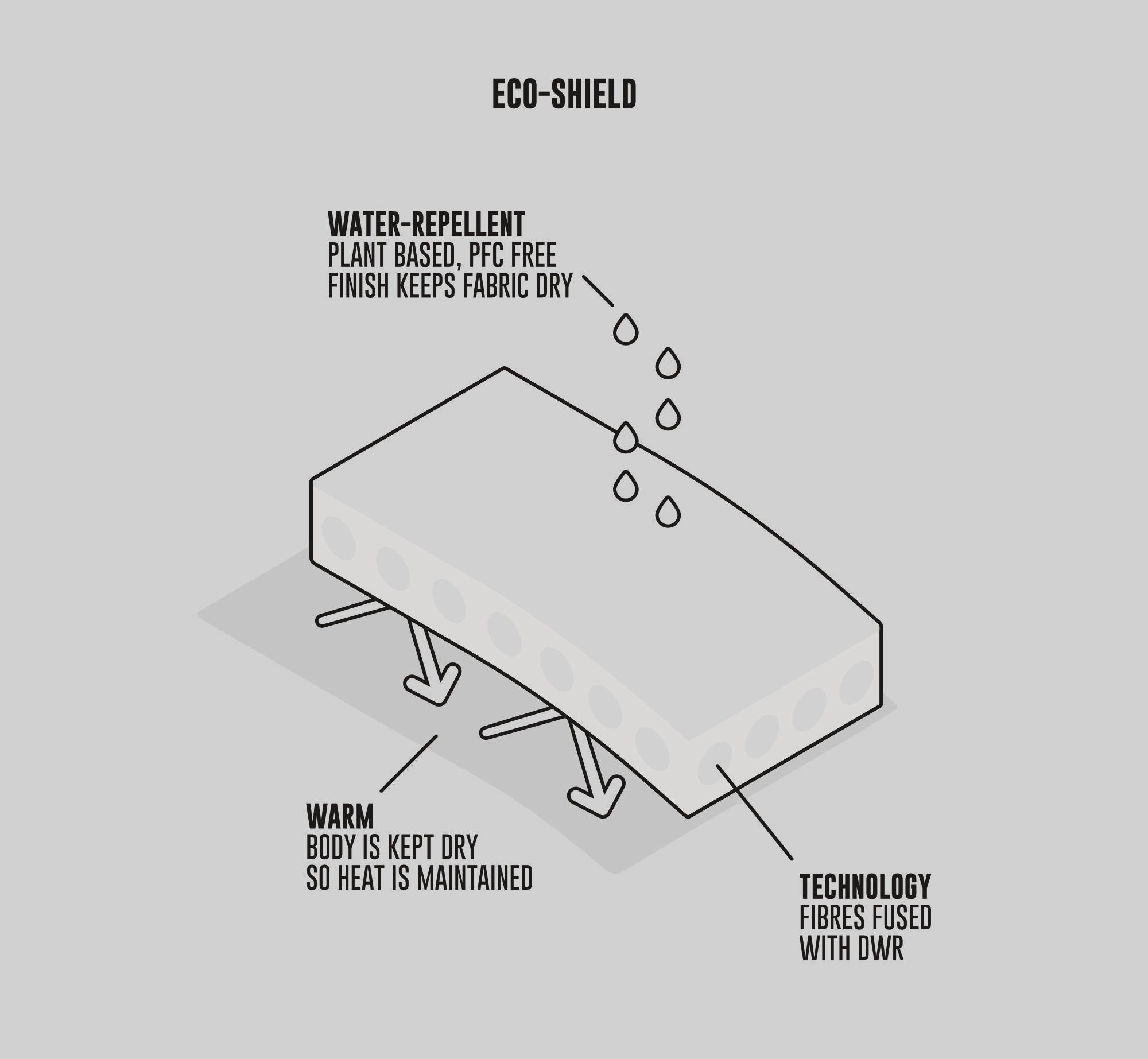 Water-repellents keep clothes drier longer, making them lighter, warmer and much more comfortable. EcoShield bonds the molecules of the water-repellent to the surface of the garment whilst still being environmentally friendly, as it is totally PFC free. 63% renewably sourced content from a variety of plant-based sources.