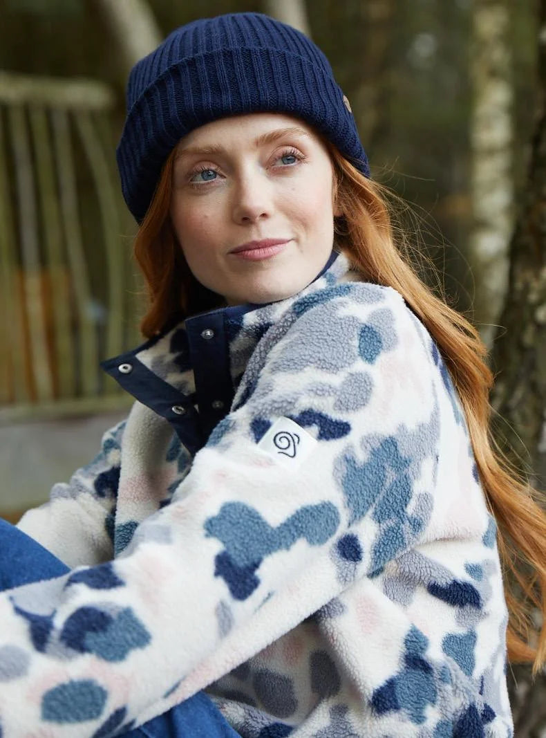 Blue Navy PrintSuper-snug fleece top from Craghoppers. ‘Eabha’ delivers effective seasonal insulation with a casual twist – thanks to the irresistible deep-pile borg fleece fabric in contemporary print options. The overhead styling features a studded placket and contrast elasticated trim.