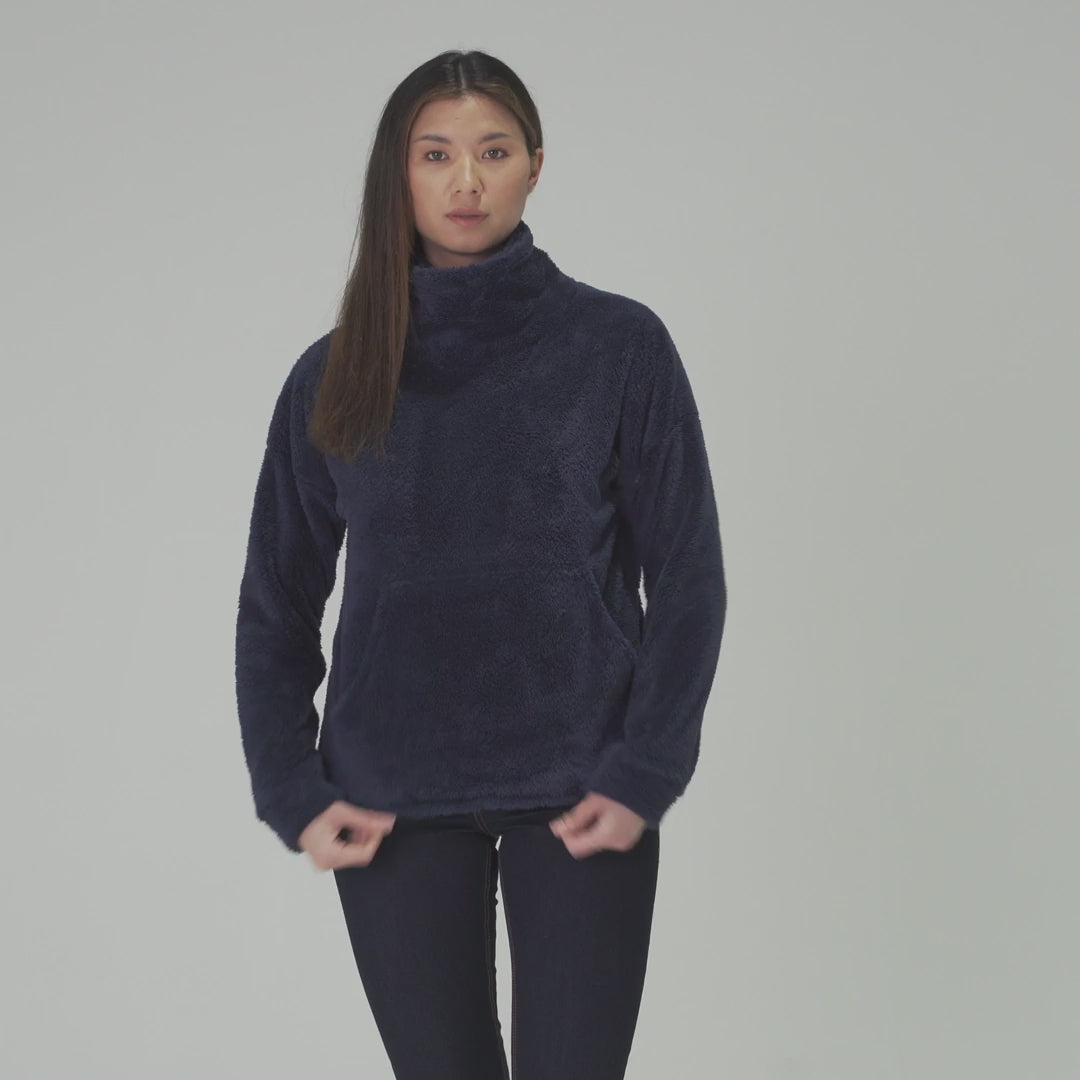 Super-soft sherpa fleece top with cowl neck and kangaroo-style pocket.